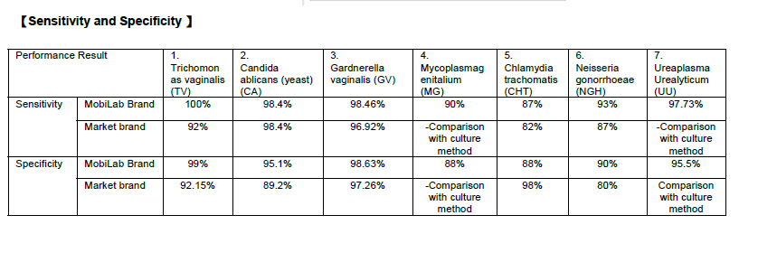 The test is designed to detect the following infections: Trichomonas vaginalis, Candida albicans, Gardnerella vaginalis, Mycoplasma genitalium, Chlamydia trachomatis, Neisseria gonorrhoeae, Ureaplasma Urealyticum. Each disease is independently presented on the test cassette.